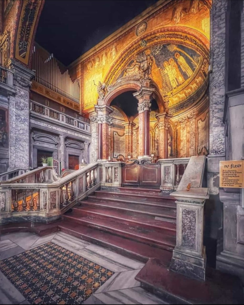 Nella chiesa di Santa Prassede, due belle gradinate di rosso antico portano all’altare maggiore, gradinate che colpirono il gusto degli emissari di Napoleone, che ordinò di rimuoverle e trasportarle a Parigi per divenire i gradini del suo trono imperiale: evidentemente, e per fortuna, il progetto andò in fumo.